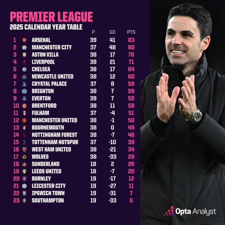 北京时间1月1日消息,2025年已经结束,Opta统计了2025年英超积分排行榜以及净胜球情况,阿森纳以83分位居榜首。目前,阿森纳多赛一场以5分优势领跑2025-26赛季积分榜。